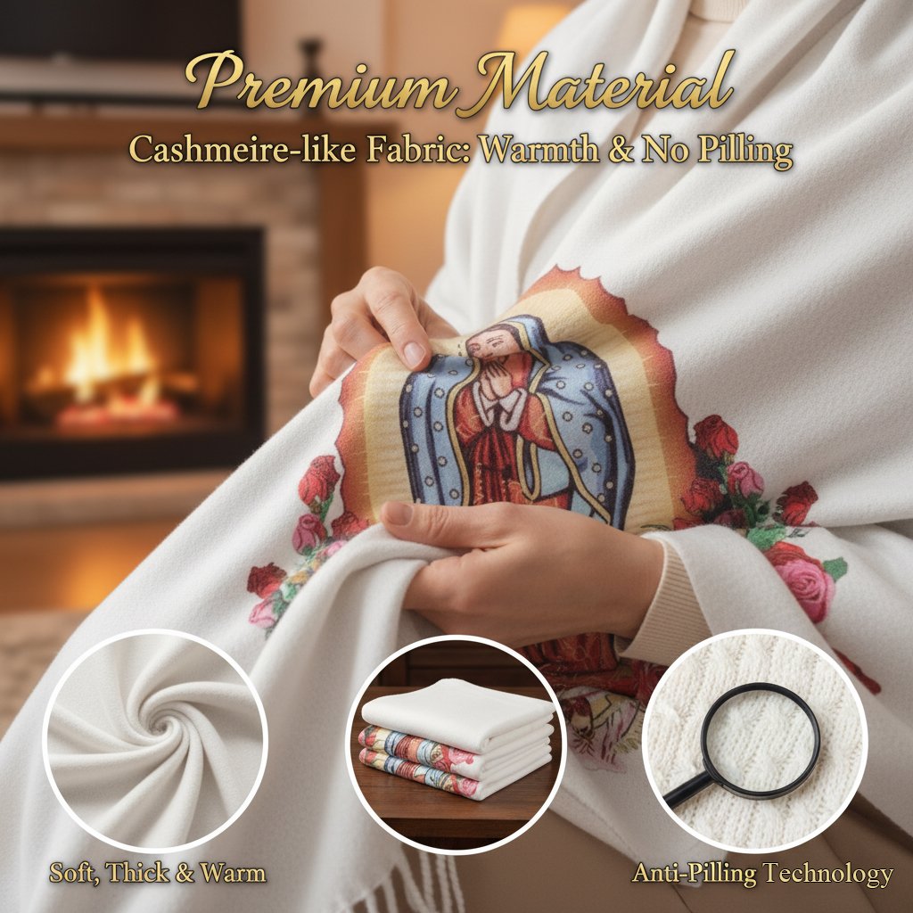 Всеки шал е украсен с изящно изображение на Дева Мария, символизиращо мир, надежда и божествена закрила. Повече от моден аксесоар, той служи като ежедневно напомняне през този свещен сезон да поддържаме вярата си и да ценим благодарността.